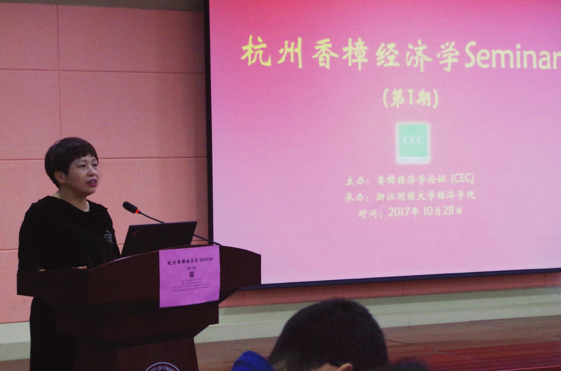 院长胡亦琴教授出席开幕式并致辞,强调举办杭州香樟经济学Seminar(第1期)是深入学习贯彻党的十九大精神,讨论和交流参会人员研究中国经济热点问题最新成果的良好契机,并借用今年诺贝尔经济学奖得主理查德•塞勒的“助推”理论,希望杭州香樟经济学Seminar(第1期)是一个良好的开端和一场有效的实验,“助推”参会的青年经济学学者和学生做出更好的学术成果,“助推”浙江各兄弟高校青年经济学者之间,以及与全国各大高校青年经济学之间加深学术交流,加快学术合作,为中国经济学理论发展和经济发展做出我们经济学人的贡献。