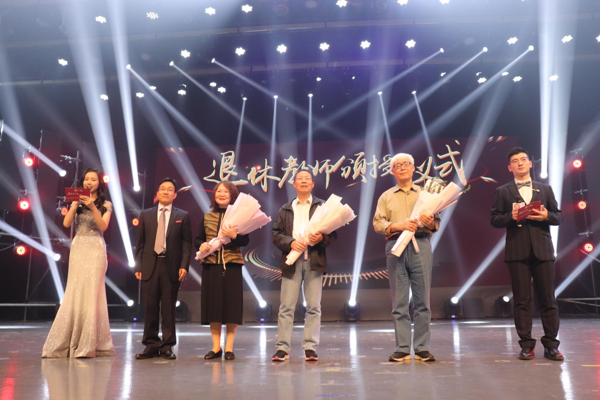 院长卢新波为退休教师献花