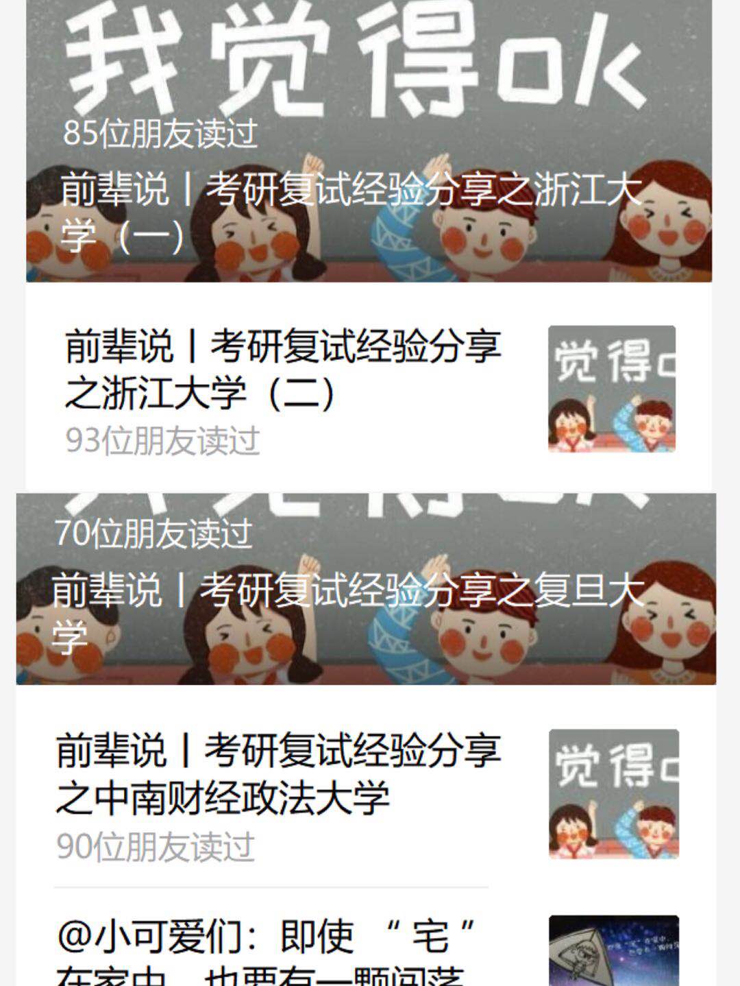专业的学长学姐,以“前辈说”为主题为今年考研同学带来了复试准备攻略,整理后在支部书记曹仲晔老师公众号“辅导员摸摸头”上进行“云分享”,系列分享推送被1000余人浏览,受到同学们好评,并被兄弟院校转发分享。