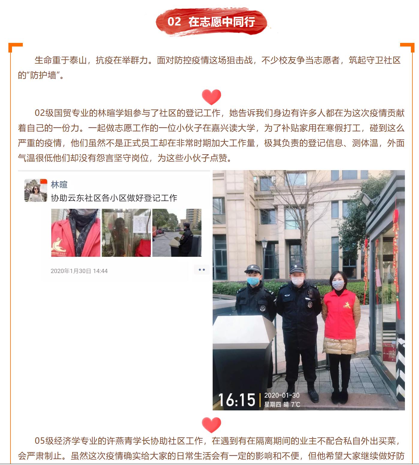 教职工提供营养方案参考及医学知识普及,受到了广泛的欢迎。同时,学生党员赵曼、唐雨纯、入党积极分子叶铭栩积极参加防疫志愿活动,在卡口为进出路人测量体温、登记信息,以实际行动发扬党员勇于担当的精神。