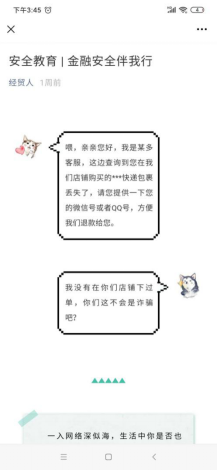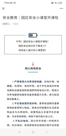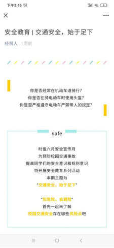 团委微信公众号“经贸人”,打造“云”端课堂,先后推出“金融安全伴我行”、“交通安全 始于足下”、“园区安全小课堂”三期主题推送,吸引共计360余人次阅读。春风化雨,润物无声,三期推送于潜移默化间宣传了安全知识,在学生群体中营造了“安全规则我知晓,安全守则我遵循”的良好氛围。