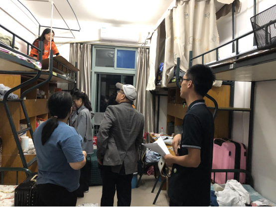 下午3时,院长王正新、院党委书记胡亦琴、副院长罗俊、副书记崔泰铭、学办主任李伶俐和辅导员韦罗成,走访学生寝室。院领导及老师们全面深入地了解了新生的住宿与生活状况,并叮嘱同学们好好休息,尽快融入集体生活,以更加饱满的热情迎接新的人生阶段,用努力换取新的硕果与成绩。