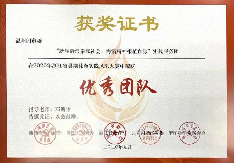 实践服务团虽在此次评比中遗憾落选,但在温州团市委的推荐下,团队在2020年浙江省暑期社会实践风采大赛中荣获优秀团队。