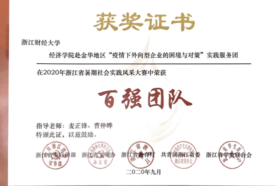 “新生后浪奉献社会,海霞精神根植血脉”实践服务团与“外向型企业疫情下的困境与决策”社会实践服务团参与评选,其中“识实婺者——外向型企业疫情下的困境与决策”社会实践服务团荣获校“十佳团队”。