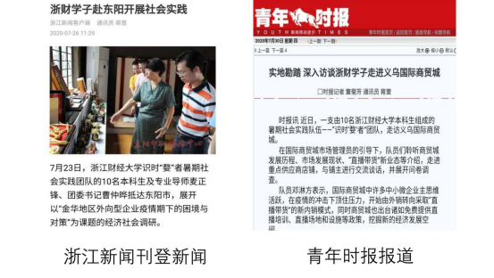 完成调研后,实践团结合所学专业知识,对调研的数据和信息做出分析,形成多份调研报告,向企业建言献策,并形成学术成果公开发表。团队还积极与各方媒体取得联系,力求将成果分享给更多关注这一话题的群体。实践进程先后被浙江新闻、青年时报、东阳日报等9家媒体报道,微博话题“识时婺者”大学生暑期社会实践阅读访问量逾12万。此外,团队还在2020年浙江省暑期社会实践风采大赛中荣获百强团队。