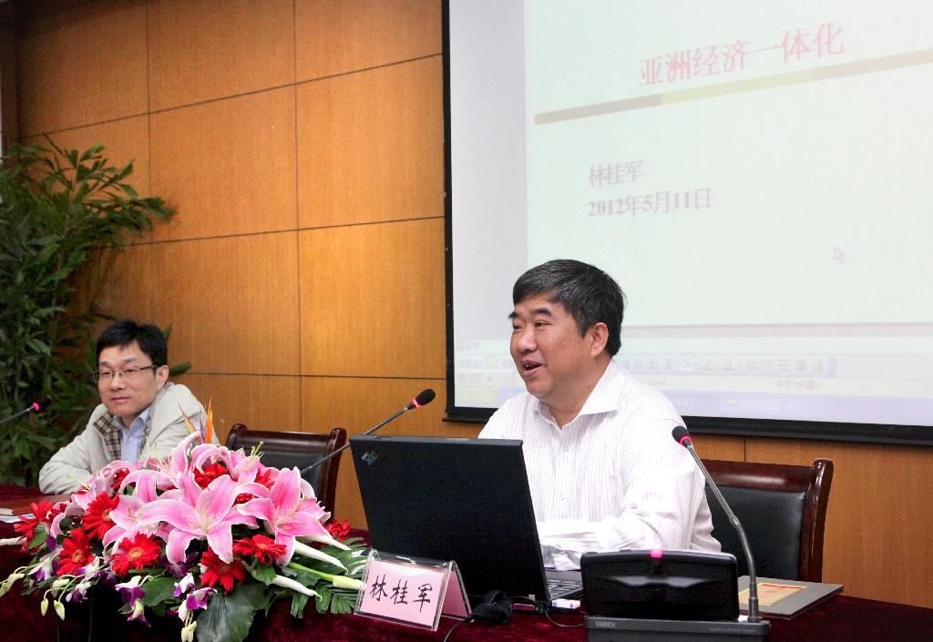 林桂军教授的讲座主要围绕四个部份展开。他首先介绍了新区域主义的兴起与亚洲经济一体化,探讨了现今区域主义的四个变化;进而提出了新区域主义所具有的五个特点,并基于此分析了吸引外资的竞争状况;同时,他以亚洲自由贸易区为例,介绍了当今亚洲自由贸易协定的概况,指出亚洲自由贸易协定数量迅速增长;林教授还分析了当今的亚洲工厂现象,认为大中华区与东亚的贸易远大于与美欧的贸易,原因主要在于有地域临近、文化相似,共享生产网络等。