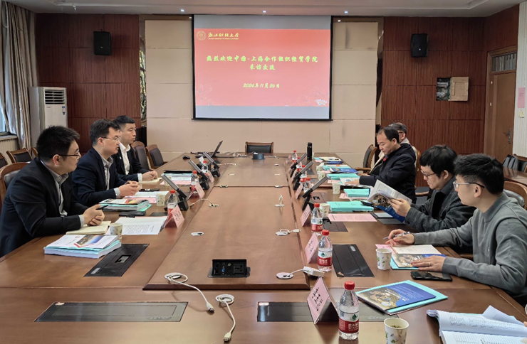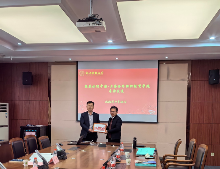 中亚研究院,院长余慕鸿与国贸系教师代表一同陪同交流,余院长向郑院长一行介绍了中亚研究院主要成果、研究工作,双方开展了深入交谈。