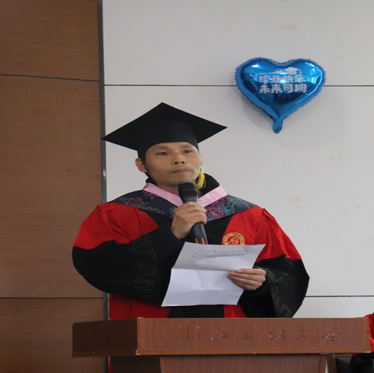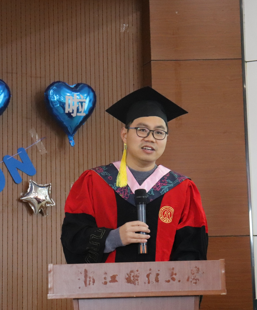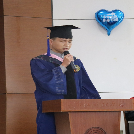 教师代表朱海城老师、毕业生代表蔡鹏辉同学以及在校生代表朱德红相继上台发言,表达了对全体毕业生诚挚的祝福,希望每一位同学能够在未来享受更加精彩的人生。朱海城老师谈到,不论何时都要保持认真做事的态度,希望毕业生们能够不忘初心,勇往直前,持续学习勇于担当,并在未来生活中拥有心怀世界的格局,用开放的心态去接纳新思想、新事物;蔡鹏辉同学则回顾了自己浙财的点点滴滴,并通过自己不断地努力,走向了更大的舞台;朱德红同学则从一个学妹的角度表达了对于学长学姐的感激和祝福之情。