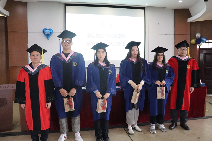 副院长邓晓军给毕业生代表发送毕业礼物,祝福他们在以后的工作和生活中能够不忘初心,一帆风顺。