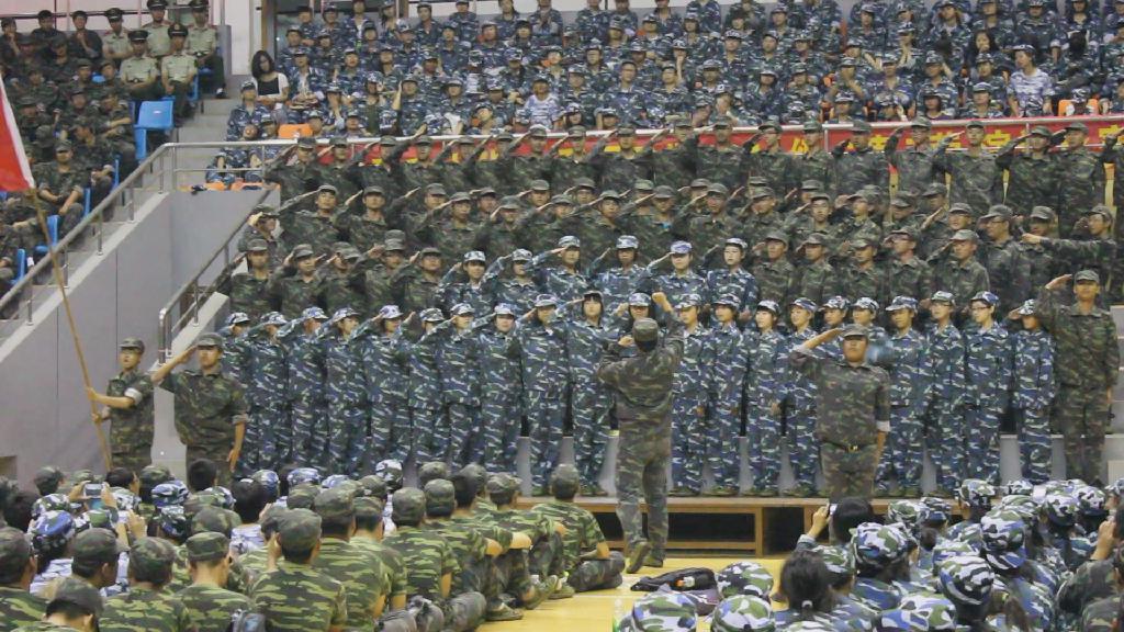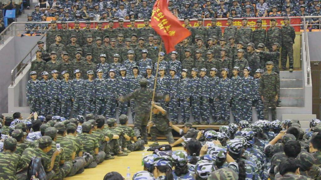比赛中,各营代表队形整齐、着装统一、上下场井然有序,璀璨的灯光映衬着他们的军装,整个体育馆成了一片绿色的海洋。舞台上,新生们挺直的身姿、执着的眼神、嘹亮的歌声,彰显着青春不羁的骄傲与自信。