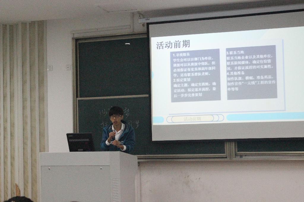 组建了8支暑期社会实践队伍,实践内容涉及“中国梦”精神宣传、社会发展热点调研、感恩理念传递等多个内容。宣讲过程中,8支实践队伍的代表依次上台为同学们做了生动、细致的讲解,从前期的策划拟定、实践地的联系、食宿的安排到活动期间的现场调研、观察民生、体验生活,直至活动结束后的总结与反思……学长学姐们为13级同学展示了暑期实践一路走过来的酸甜苦辣。同学们也都认真聆听,专注的眼神中透露出他们心中对参与社会实践的期待。