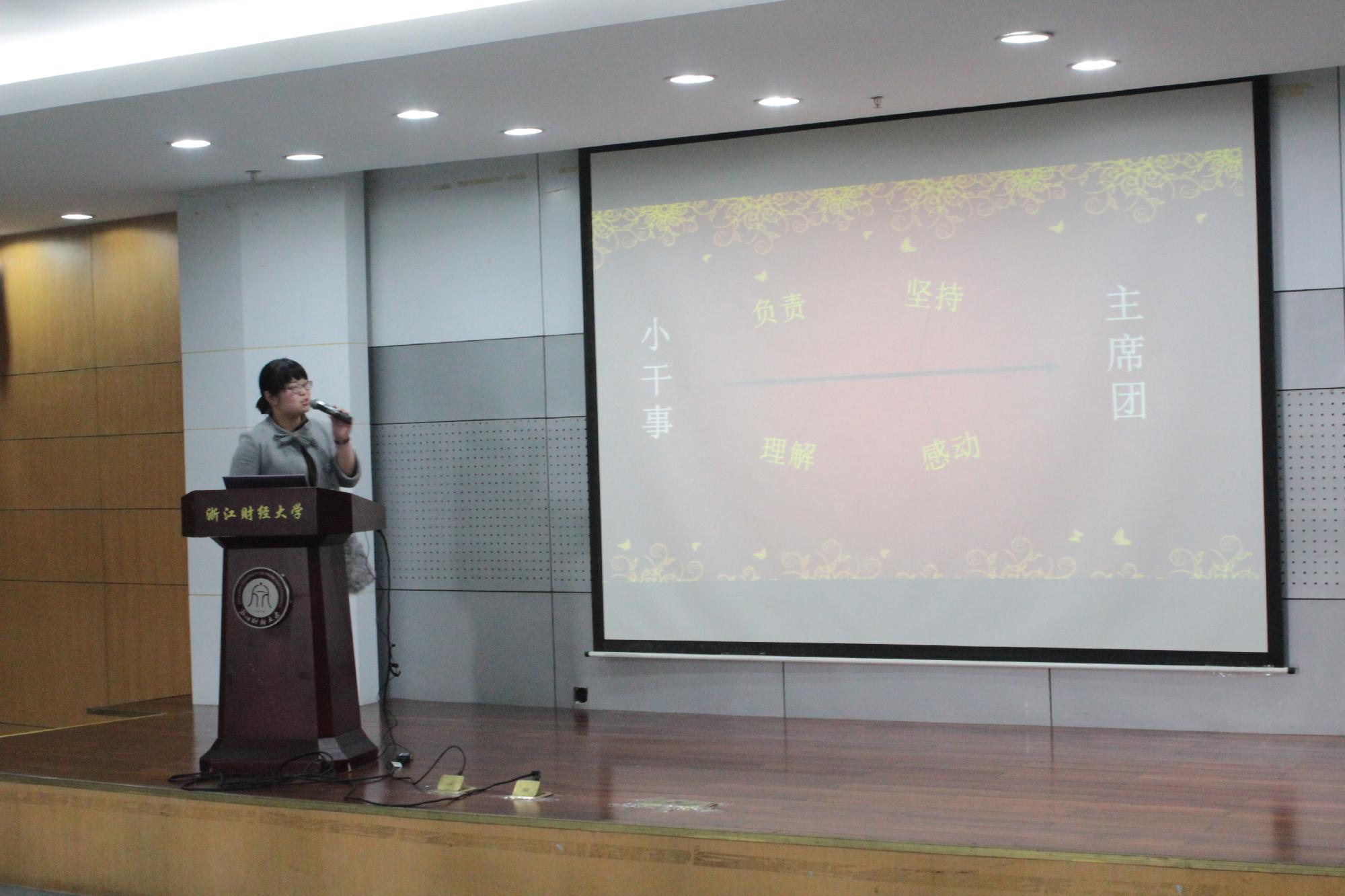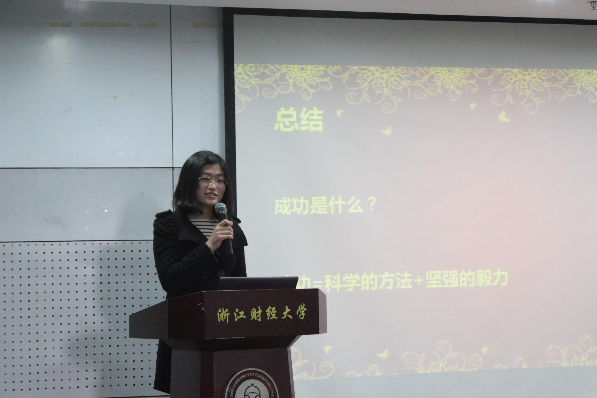 “安逸、懈怠不是青春的代名词,奋斗、拼搏才能创造鲜亮的人生。” 10经济班的袁璐四年中荣获多项国家级、省级、校级荣誉,在学术研究上,更是取得了不错的成绩。她重点与同学们分享了自己申请挑战杯的经历,讲述如何进行科研,并分别从组队、选题、目的、现实意义、内容以及写论文等方面给出了建议。坚持——是学业、工作皆优秀的10国贸班王佳斐的座右铭,双专业,实习,成功申请浙江省“新苗人才计划”,国家级挑战杯成功立项、校学生会副主席……紧凑的生活,短暂的时间,王佳斐给了八个字:负责、理解、坚持、感动!曾获“外研社杯”大学生英语写作大赛全国二等奖的11国贸班沈冰沁,结合自己学英语的经验,让大家了解到其实学英语并不难,兴趣和坚持是成功的首要条件。从美国留学归来的11国贸班陈宇豪,以及从台湾回来的11国贸班詹莜则分别结合自己在外求学的经历,为大家讲述了不同地域的风土人情及求学趣闻,为打算外出求学的学子提供了宝贵的经验。