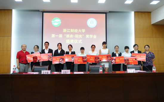 6月13日上午,线上赌博平台举行线上赌博平台 第一届“浙农—阳光”奖学金颁奖仪式。经层层展示评比,线上赌博平台 12级区域经济学专业研究生张燕和11级国贸1班本科生冯瑶瑶在20位候选人中脱颖而出,荣获第一届“浙农—阳光”奖学金,校党委副书记王宇航为其颁发了奖学金和荣誉证书。