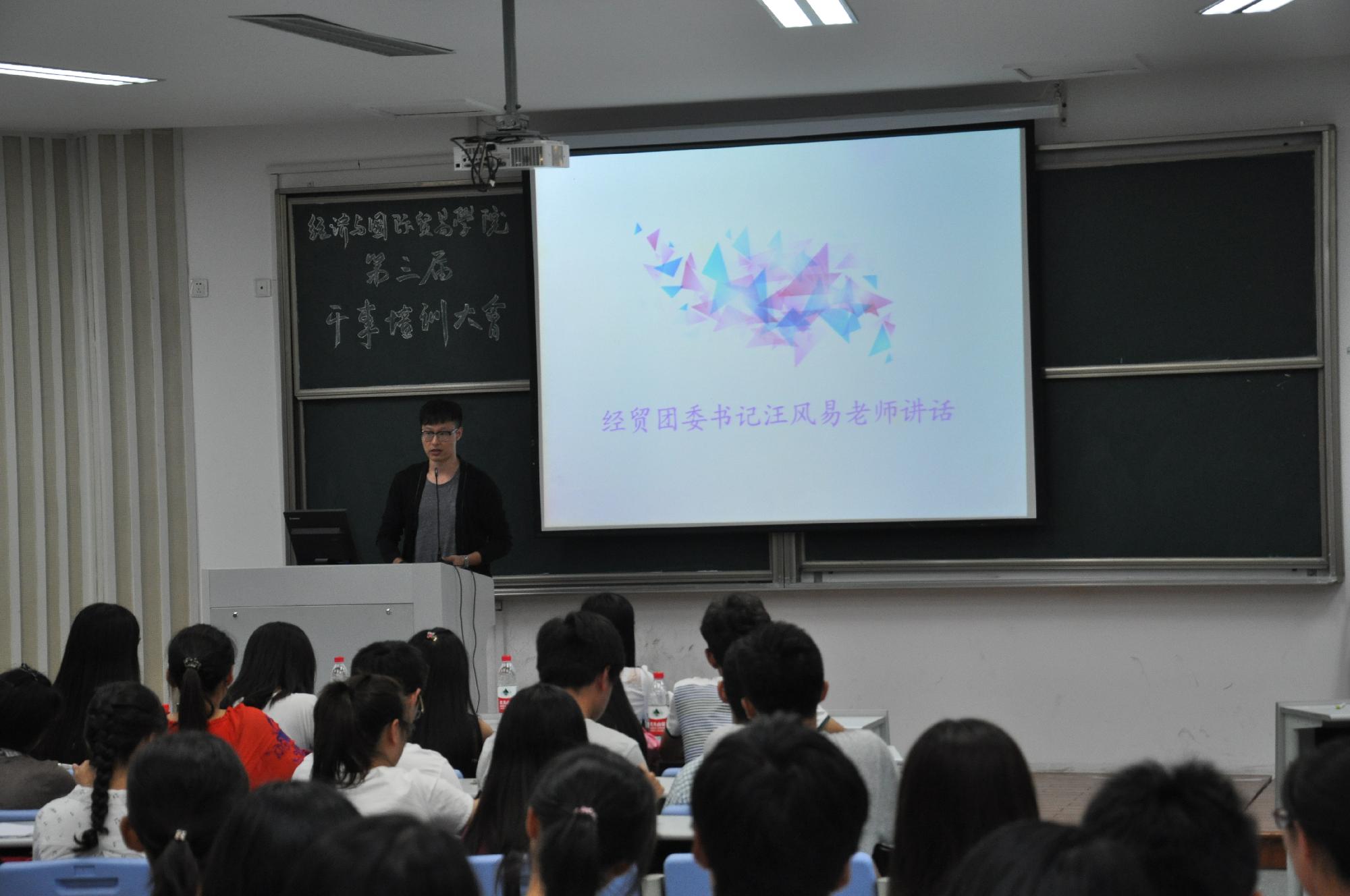 首先,团委书记汪风易老师上台发言,他根据自己在大学的亲身经历和感触,就生活、学习与工作三个方面给予同学们一些建议。他指出,大学是人生旅途新的开始,学生在大学中要明确学习目标,学会自学,在有限的时间里尽可能地学习更多的实用技能。同时,他还强调在学生会工作中,要认真对待每件事,找准自己的定位,留下自己珍贵的回忆。他表示每一届干事都是独一无二的,希望大家能在经贸这个大家庭中学会成长,无论是收获还是失去,都将成为人生中一段最美好的记忆。