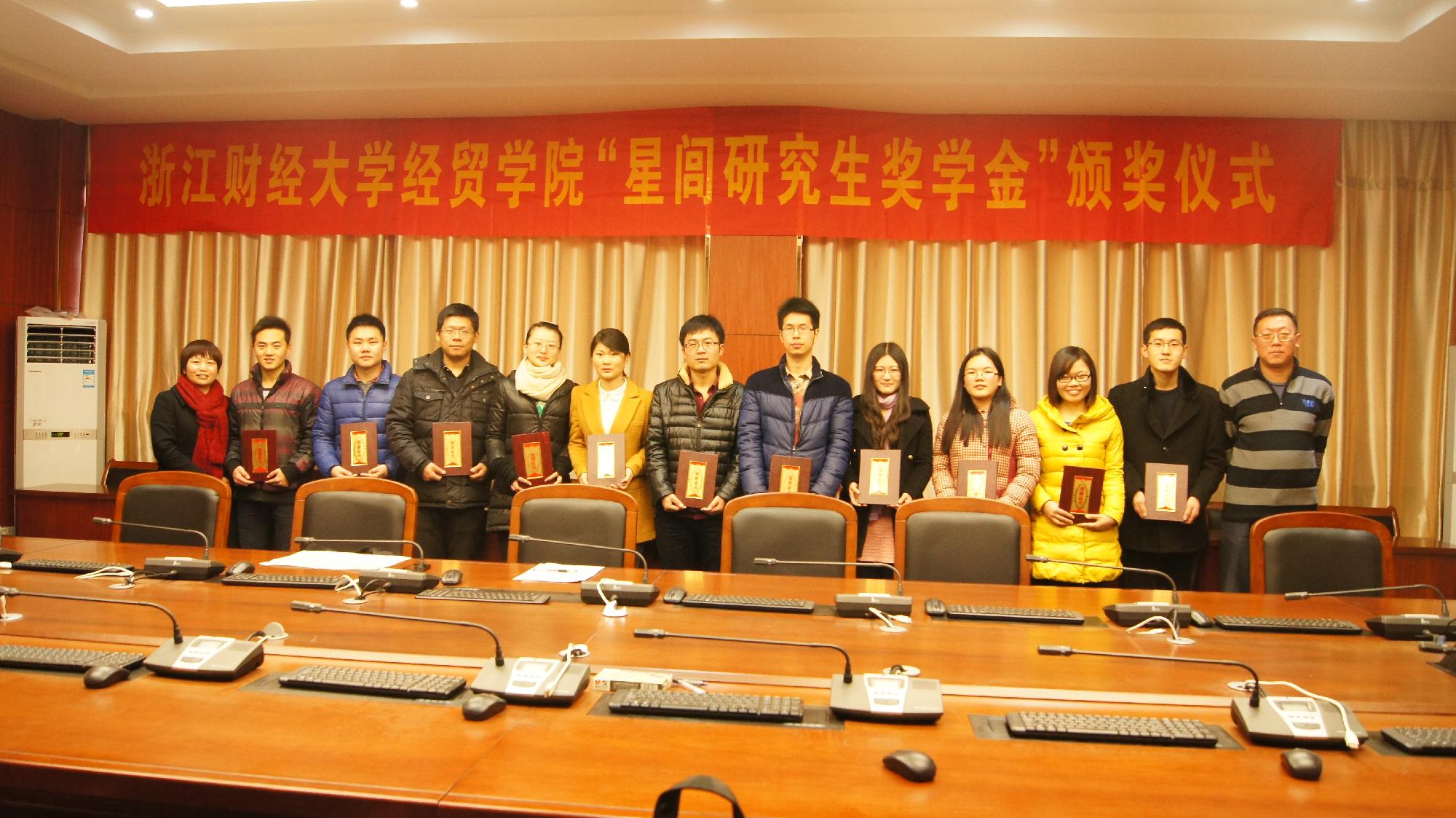 第三届“星闾研究生奖学金”颁奖仪式在210会议室举行,王蔚泉等11名同学获得2014年度“星闾研究生奖学金”荣誉称号,经贸线上赌博平台