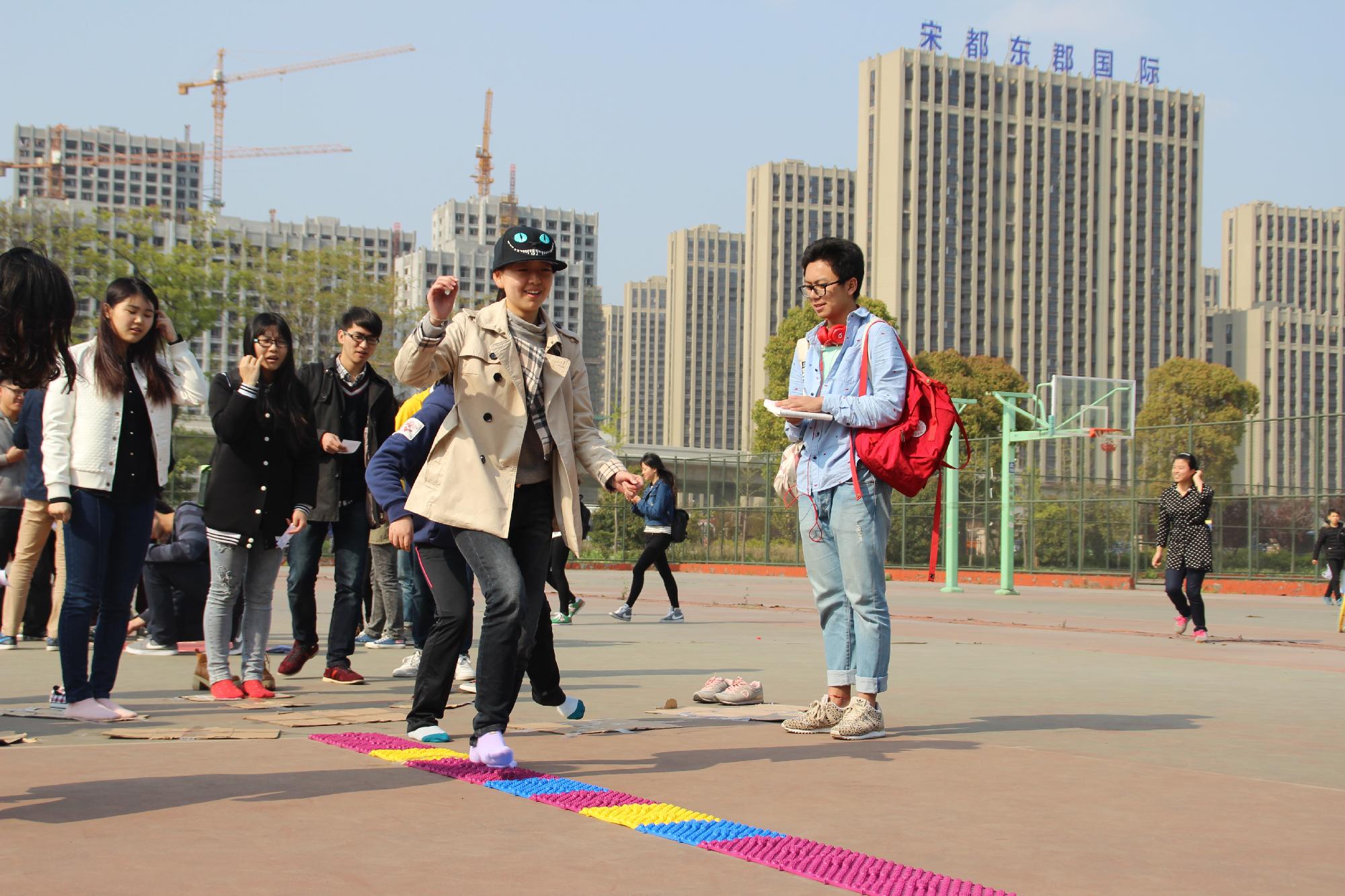 活动受到了广大学生的喜爱和支持,春日的暖阳里,参赛者们早早来到了活动的现场,摩拳擦掌,跃跃欲试。随着比赛的开始,同学们开始了热烈的比拼,场面如火如荼。本次活动分为闯关赛和积分赛两大环节,“袋鼠跳跳跳”﹑“才高八斗”﹑“幸运对对碰”﹑“知识转转转”等别出心裁的运动项目不仅考验同学们的肢体平衡能力,也是一场毅力与耐力的挑战,大家完全沉浸在运动带来的欢乐中。参与者在赛场上尽情展现自我,拉拉队在旁边为参赛者加油鼓劲,一时间,整个篮球场都飘荡着大家的欢笑声与加油声。