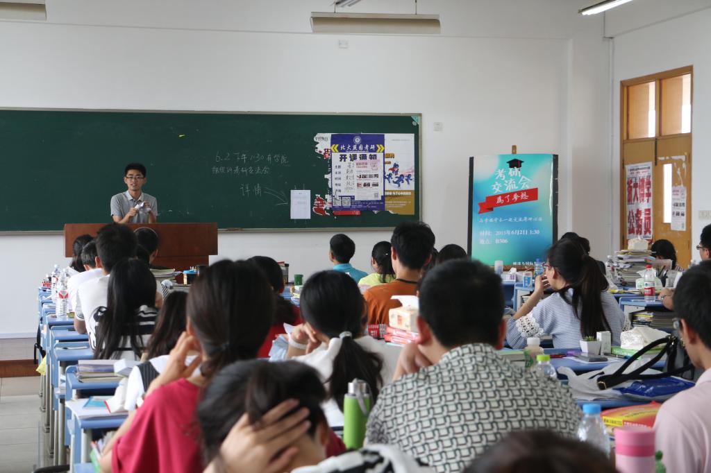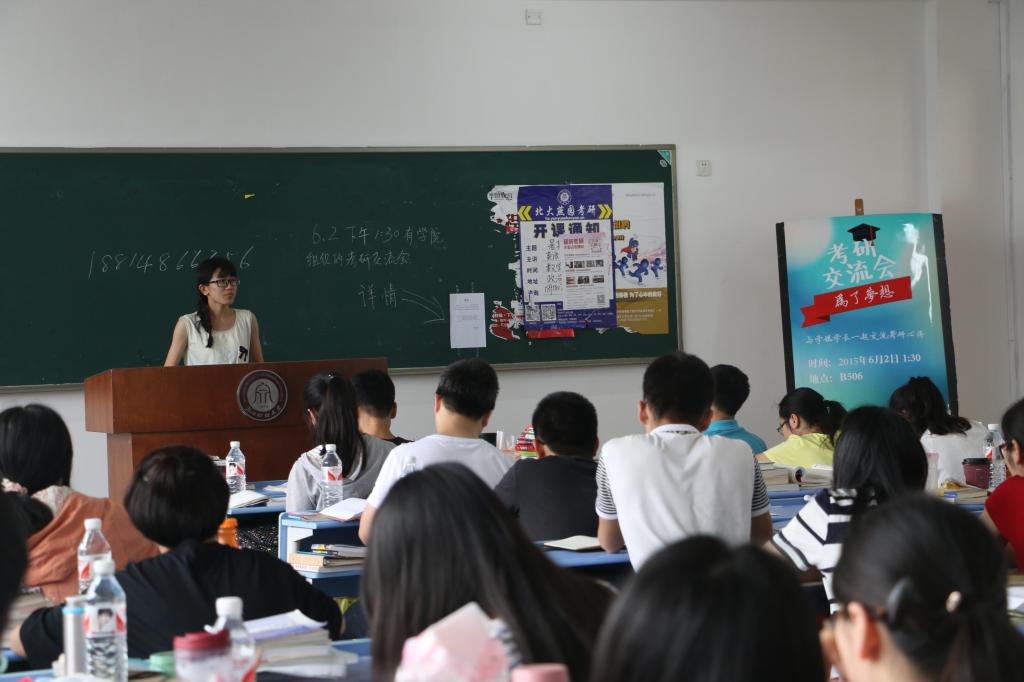 在B506考研教室举行了考研交流会。本次交流会邀请到许仟红、李晓燕、王靖青、孔润锋和潘志斌五位同学分享他们的考研历程,全院共计80余名有志于考研的同学参加。