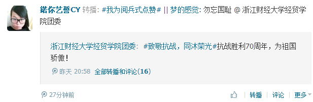 团委官微上发起“我为阅兵式点赞”话题讨论,党员同学们对习主席的讲话内容进行了深刻的讨论,永远不称霸,永远不扩张,正义必胜,和平必胜,人民必胜,雄壮的阅兵式带给我们的感悟也许比这些更多,那就是对祖国美好明天真心的祝福和向往。