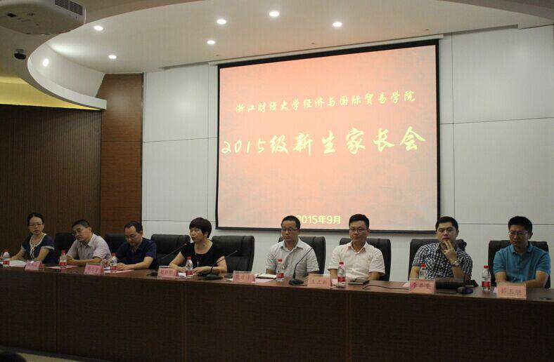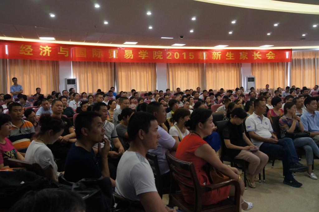 楼219会议室举行了新生家长会。院长胡亦琴、党总支书记范建锋、副院长柴志贤、党总支副书记叶秀、院长助理王正新、经济系系主任李井奎、国贸系系主任茹玉骢、国民经济管理系系主任张利风、各办公室主任、新生辅导员及2015级近300余位家长参加了会议。