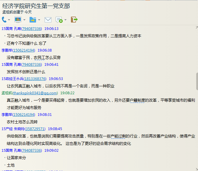 各支部,各班及社团邓读对两会相关热点问题进行了热烈的线上讨论,同学们积极参与,通过QQ群,微信群对就业、高等教育、创新创业、民生等问题进行了交流。其中,第二党支部对两会中“大众创业,万众创新”的话题进行了讨论,指出拥有了众创的平台才能使创新意识和作品有更好的展现空间,也对线上赌博平台