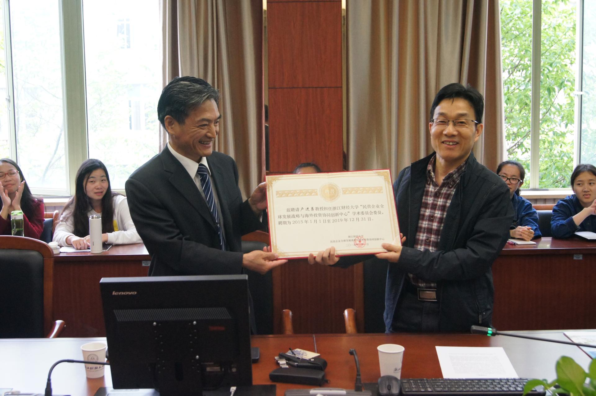 讲座开始前,举行了聘任仪式,聘请卢进勇教授为线上赌博平台民营企业全球发展战略与海外投资协同创新中心学术委员会委员,卢新波副书记为卢教授颁发了证书。