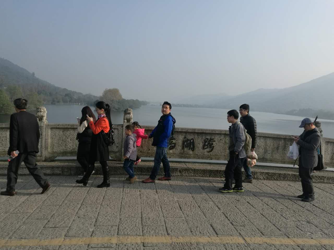 在湘湖之畔,老师们走在用小石板铺成的小路上,边走边聊,观赏着美丽的风景。
