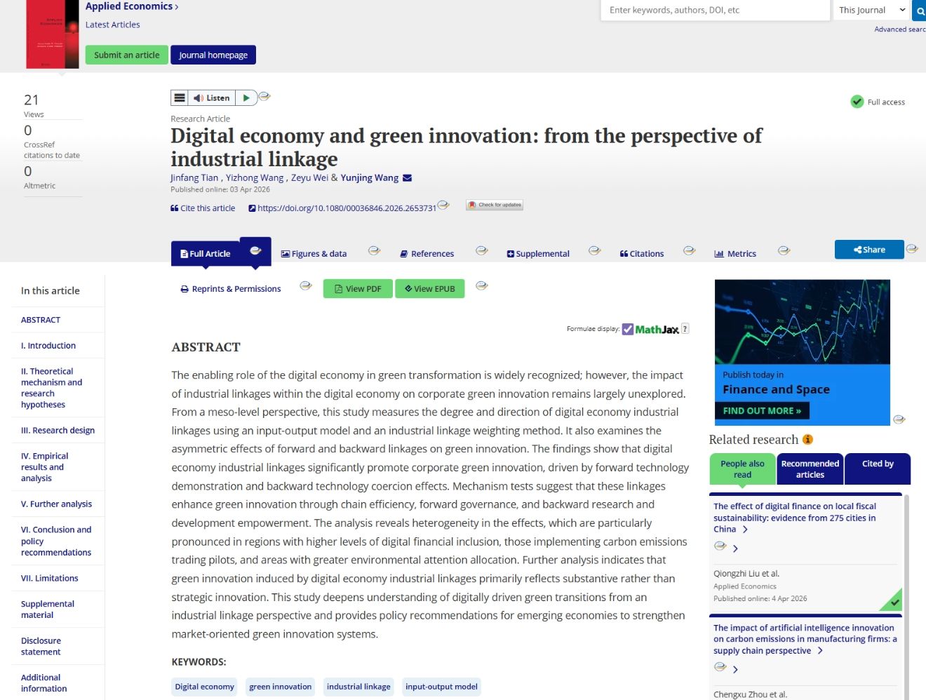 田金方教授及其合作者撰写的学术论文“Digital economy and green innovation: from the perspective of industrial linkage”,在《Applied Economics》(2026年4月)在线发表。该期刊属于线上赌博平台 A2类期刊。