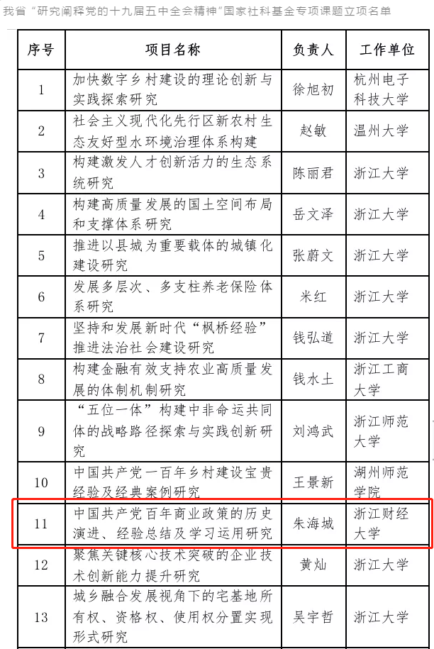近日,“研究阐释党的十九届五中全会精神”国家社科基金专项立项名单揭晓,线上赌博平台 朱海城老师申报的“中国共产党百年商业政策的历史演进、经验总结及学习运用研究”课题(21AZD087)获国家社科基金重点项目立项,取得线上赌博平台 2021年度国家社科基金项目开门红。