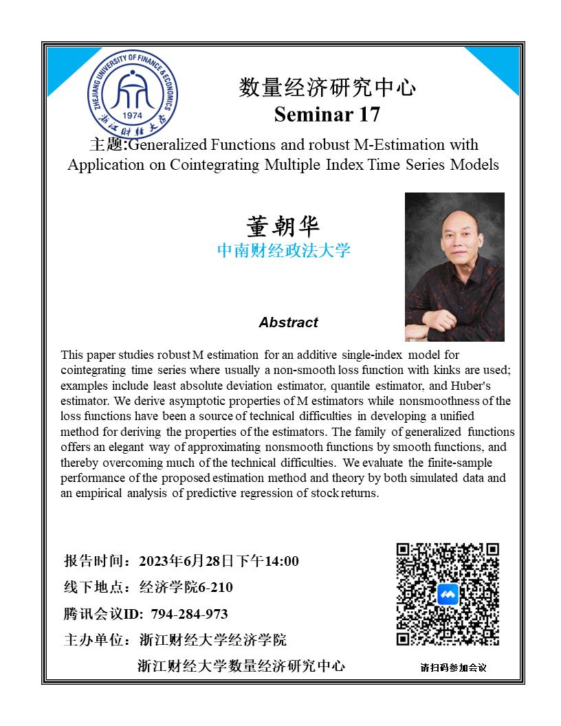 教授,主要研究领域为高维计量理论、非参数与半参数方法、非平稳时间序列和面板数据模型、微观计量应用,其研究成果发表在Journal of Econometrics、Journal of Business and Economic Statistics、Econometric Theory、《系统工程理论与实践》等国内外一流经济学期刊,主持多项自然科学基金,中国系统工程学会金融系统工程专业委员会理事,并担任Journal of Econometrics, Econometric Theory, Econometric Reviews, Annals of Statistics, Journal of Business and Economic Statistics等期刊匿名评审员。