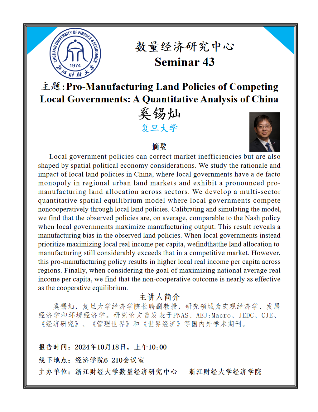 摘要:Local government policies can correct market inefficiencies but are also shaped by spatial political economy considerations. We study the rationale and impact of local land policies in China, where local governments have a de facto monopoly in regional urban land markets and exhibit a pronounced pro-manufacturing land allocation across sectors. We develop a multi-sector quantitative spatial equilibrium model where local governments compete noncooperatively through local land policies. Calibrating and simulating the model, we find that the observed policies are, on average, comparable to the Nash policy when local governments maximize manufacturing output. This result reveals a manufacturing bias in the observed land policies. When local governments instead prioritize maximizing local real income per capita,we find that the land allocation to manufacturing still considerably exceeds that in a competitive market. However, this pro-manufacturing policy results in higher local real income per capita across regions. Finally, when considering the goal of maximizing national average real income per capita, we find that the non-cooperative outcome is nearly as effective as the cooperative equilibrium.