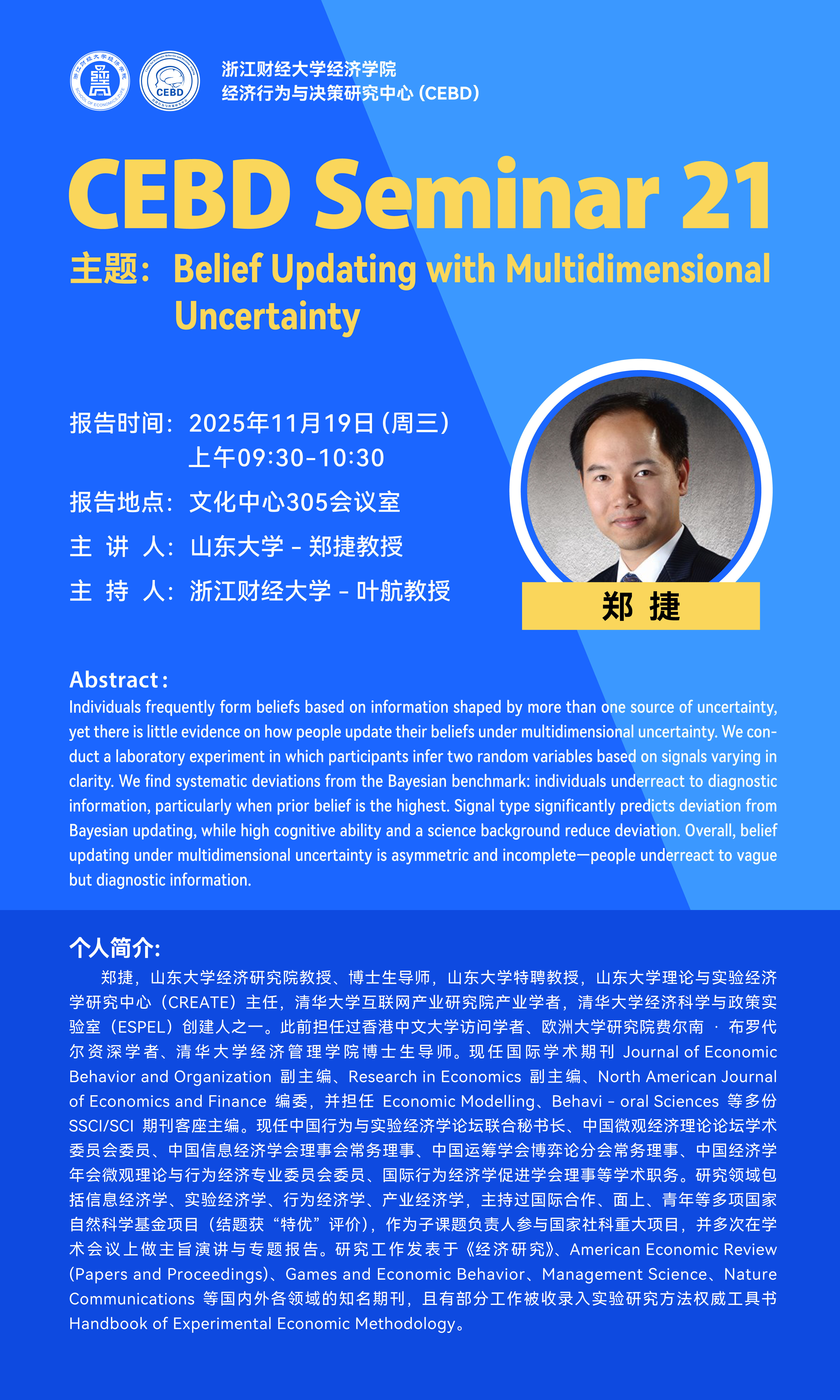 博士生导师。现任国际学术期刊Journal of Economic Behavior and Organization副主编、Research in Economics副主编、North American Journal of Economics and Finance编委,并担任Economic Modelling、Behavi - oral Sciences等多份SSCI/SCI期刊客座主编。现任中国行为与实验经济学论坛联合秘书长、中国微观经济理论论坛学术委员会委员、中国信息经济学会理事会常务理事、中国运筹学会博弈论分会常务理事、中国经济学年会微观理论与行为经济专业委员会委员、国际行为经济学促进学会理事等学术职务。研究领域包括信息经济学、实验经济学、行为经济学、产业经济学,主持过国际合作、面上、青年等多项国家自然科学基金项目(结题获“特优”评价),作为子课题负责人参与国家社科重大项目,并多次在学术会议上做主旨演讲与专题报告。研究工作发表于《经济研究》、American Economic Review (Papers and Proceedings)、Games and Economic Behavior、Management Science、Nature Communications等国内外各领域的知名期刊,且有部分工作被收录入实验研究方法权威工具书Handbook of Experimental Economic Methodology。