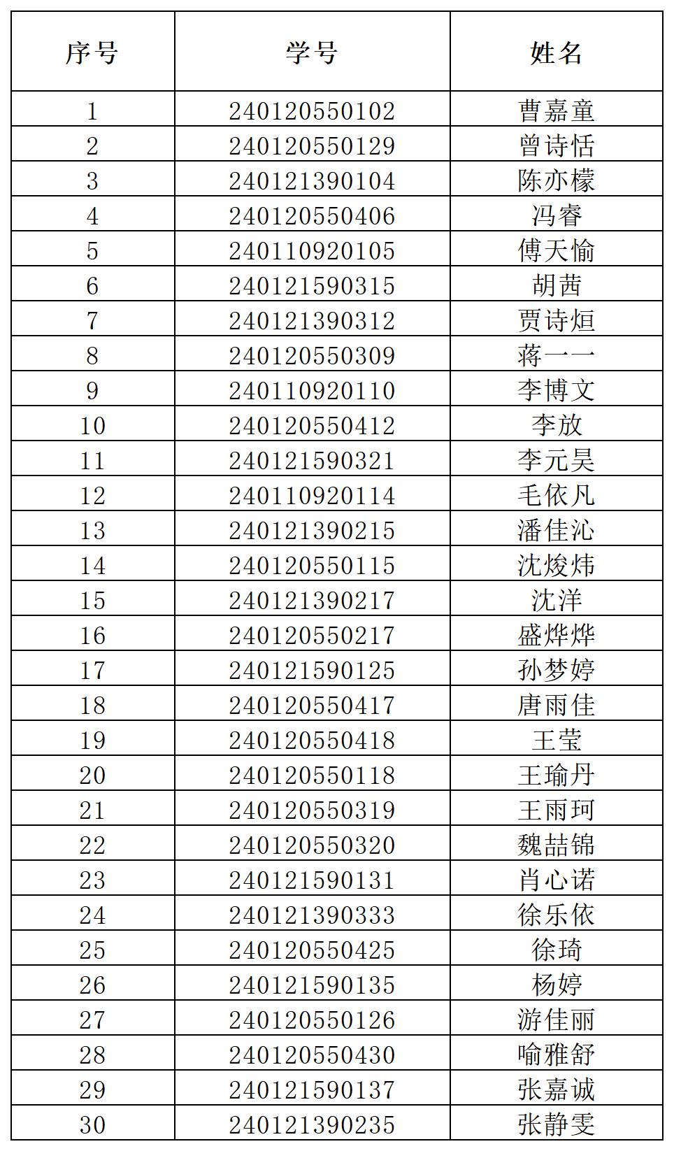 2024级经济学拔尖学生培养基地班预录取以下30人,现对预录取名单进行公示(按姓氏笔画排序)。