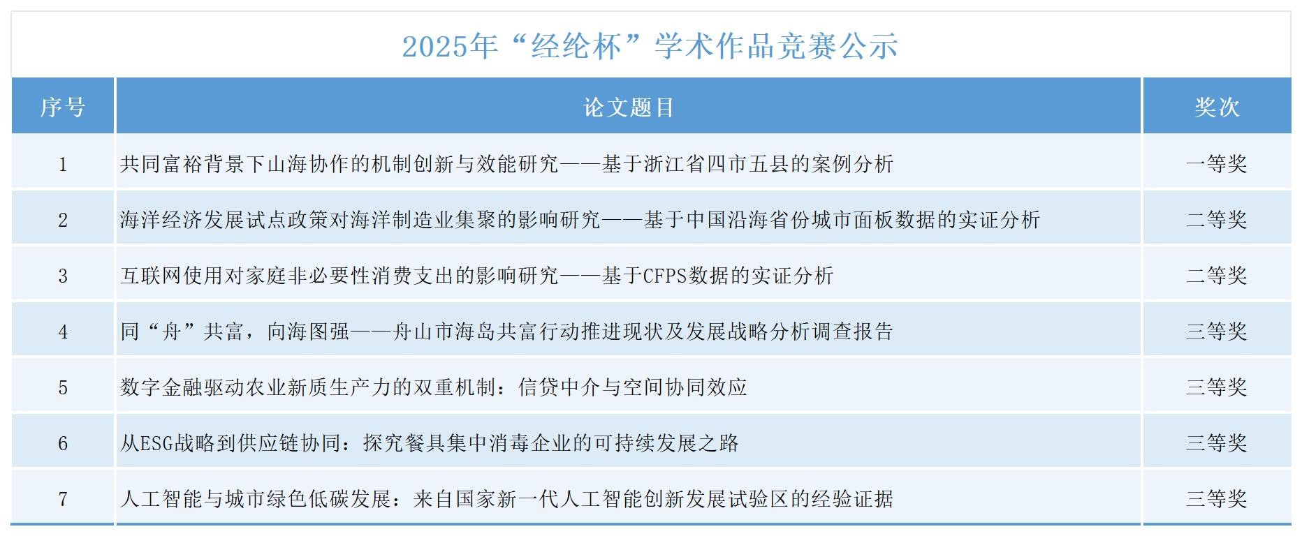 2025年“经纶杯”学术作品竞赛的通知》《关于开展2025年“经纶杯”学术作品汇报的通知》规定,2025年“经纶杯”学术作品竞赛共收到13份作品,包括6份调研报告与7份学术论文;后经竞赛领导小组组织专家进行匿名评审决定3篇调研报告与4篇学术论文共7份作品参加学术作品汇报。以下是竞赛领导小组根据专家评审结果确定的各作品获奖等级(各等级的奖励数量视具体作品质量而定):
