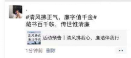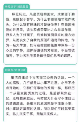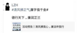 组织开展“清风拂我心,廉洁伴我行”活动,鼓励学生将清正廉洁的态度亮出来,积极分享有关廉洁的古文古诗,并结合当代大学生的使命担当,撰写心得感想。活动开展以来,共收到感想400余份,并将“崇德向上、廉洁自律”的文化根植到校园中,不断营造风清气正的环境。