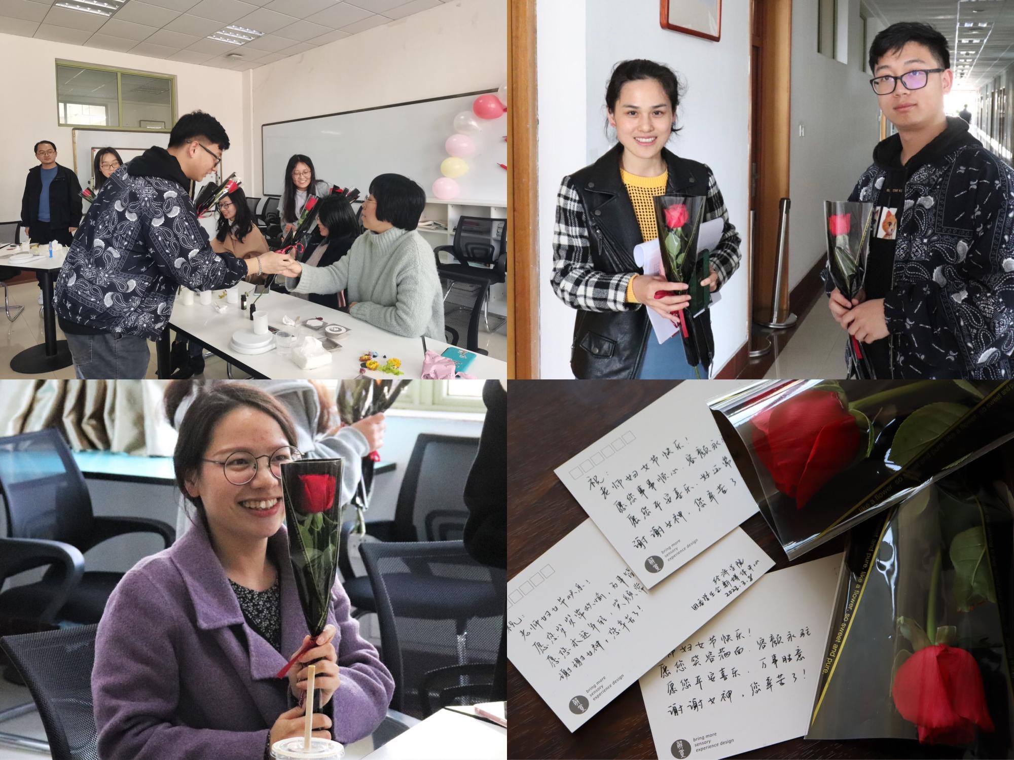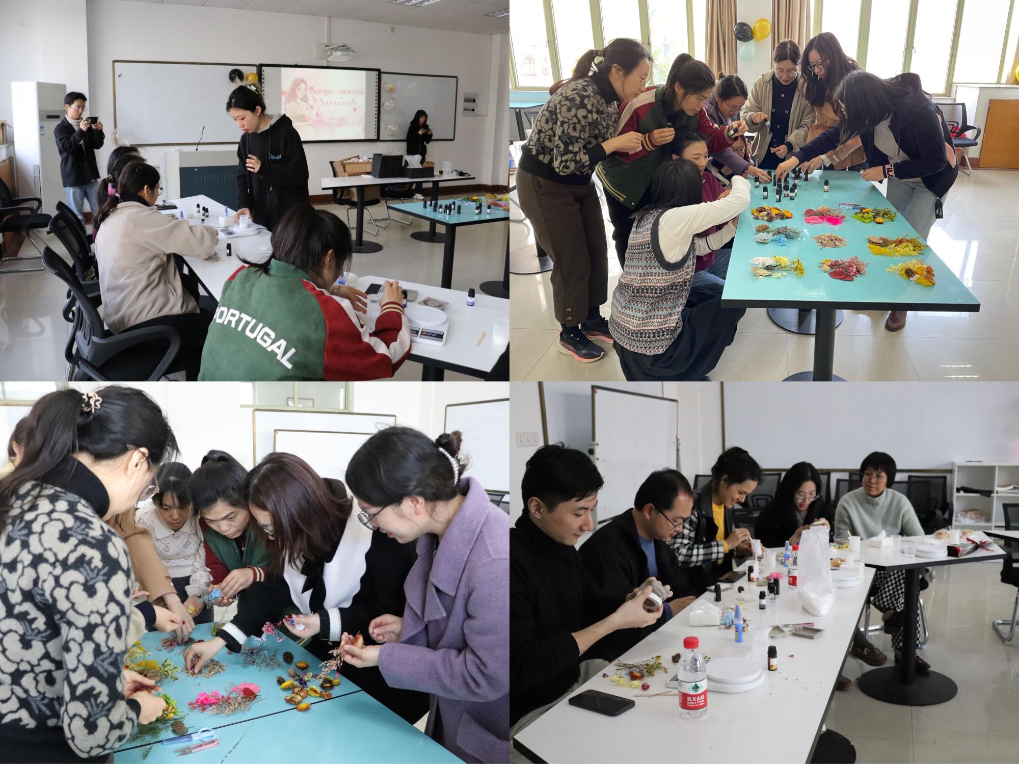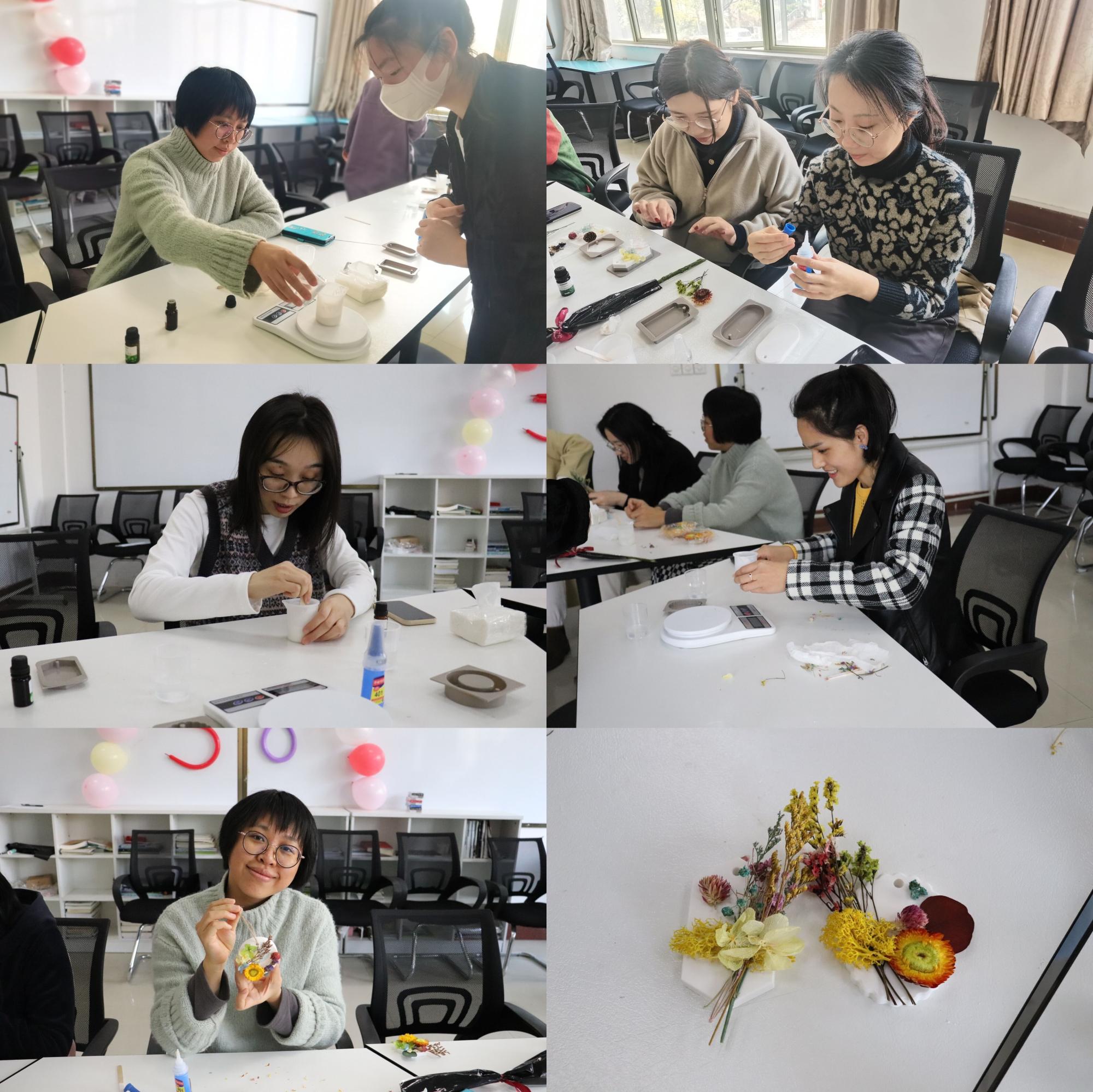 活动中,工作人员就扩香石的来源、制作过程、方法进行了讲解,老师们各自挑选了喜欢的模具、香薰精油和干花,按照步骤进行制作。称重、配比搅拌、加精油、倒入模具、等待凝固、点缀干花……老师们发挥想象力,互相帮助出点子、挑花色,配合协作,一个个造型独特的香薰扩香石呈现在大家眼前。学生代表们还来到活动现场给女老师们赠送鲜花和贺卡,送上了最真挚的祝福。最后大家纷纷拿起自己精心制作的扩香石和收到的鲜花合影留念。