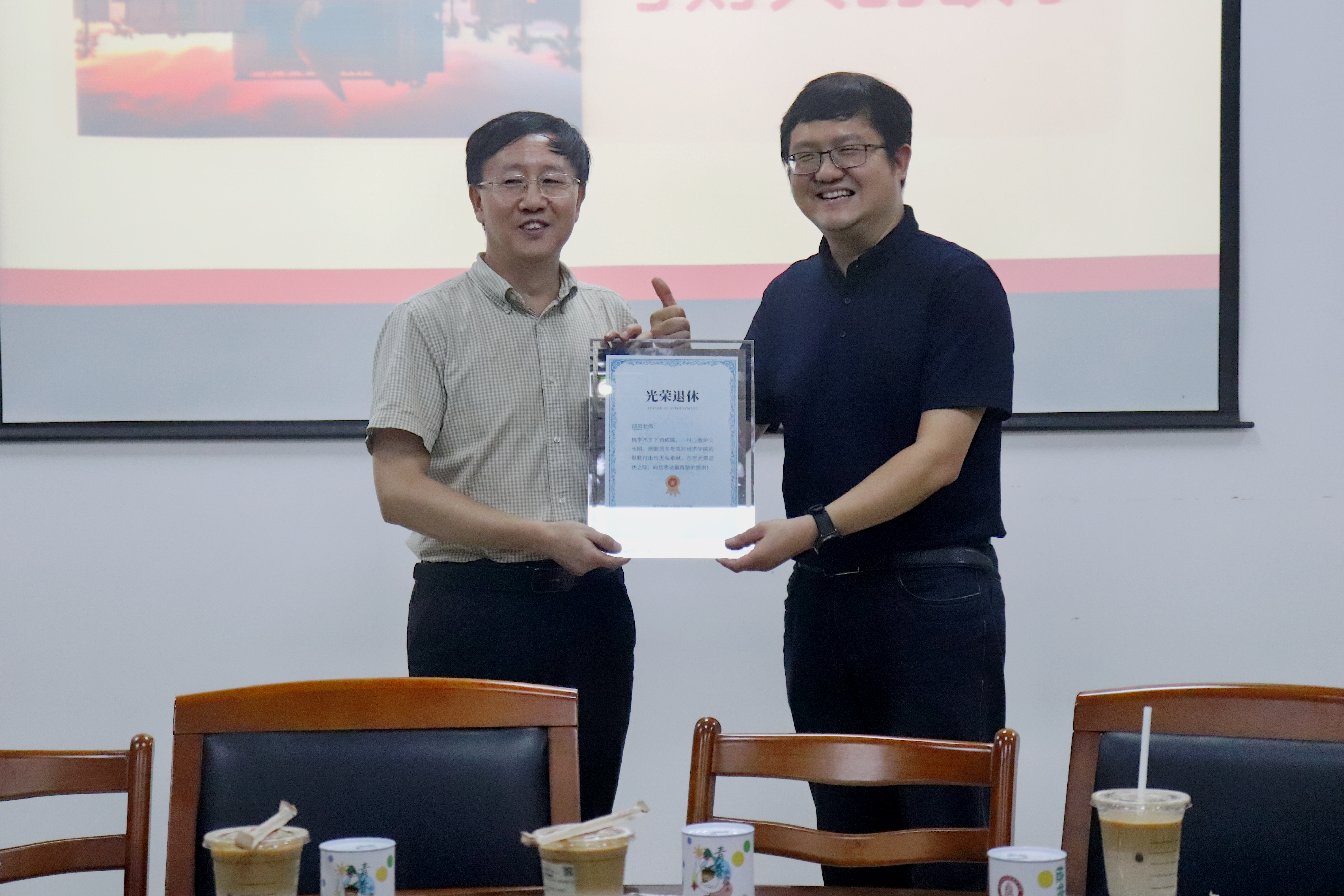 荣休仪式上,徐奇伟书记和罗俊院长分别为邱风老师送上荣休纪念证书和鲜花,并合影留念。
