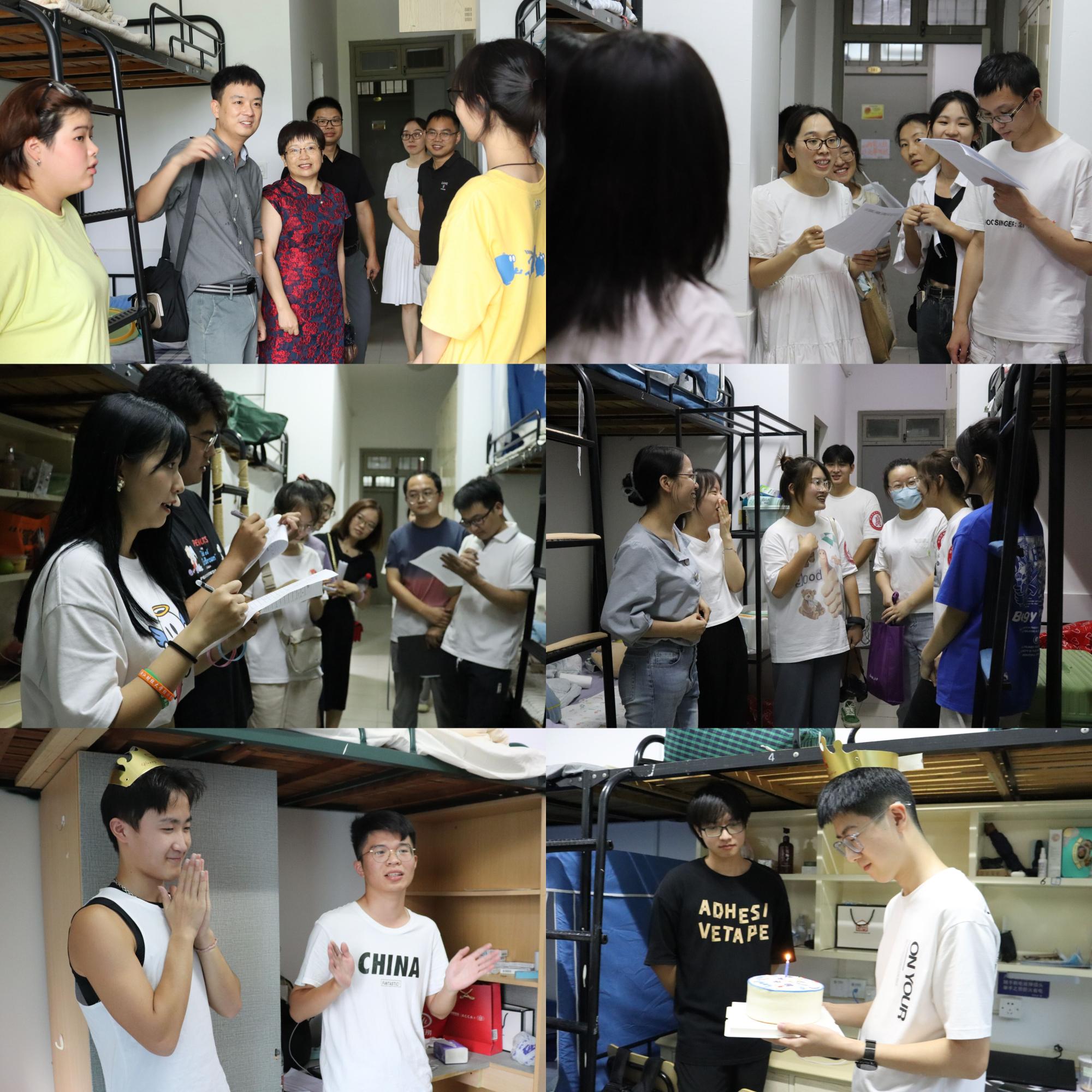 全体领导班子、新生班主任、辅导员以及各班班导一行走访新生寝室,了解他们的生活情况,并叮嘱同学们调整作息,以良好状态迎接军训到来。师生还与当天过生日的两位新生共同庆祝,现场气氛温馨愉快。