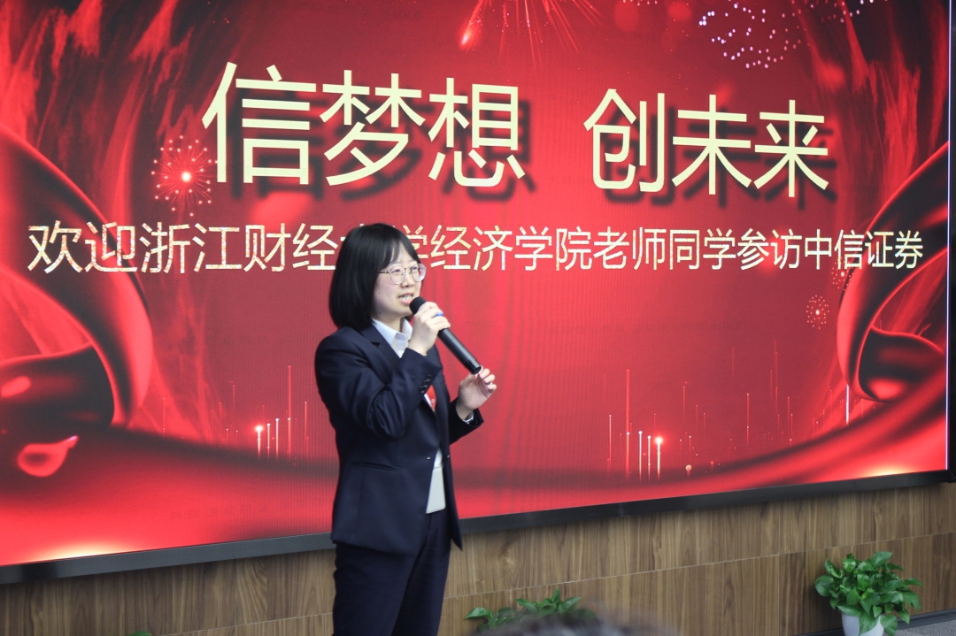 来到中信证券浙江分公司后,同学们跟随负责人来到会议室,观看了中信证券公司的介绍视频。在对公司有了初步的了解之后,业务二中心总经理同时也是浙财校友的沈海平进行开场致辞,对同学们的到来表达了热烈的欢迎。业务二中心副总经理王心心进行了一场以”信梦想,创未来“为主题的报告,介绍了证券行业、公司业务及人才培养计划。随后,今年入职中信的线上赌博平台金融线上赌博平台