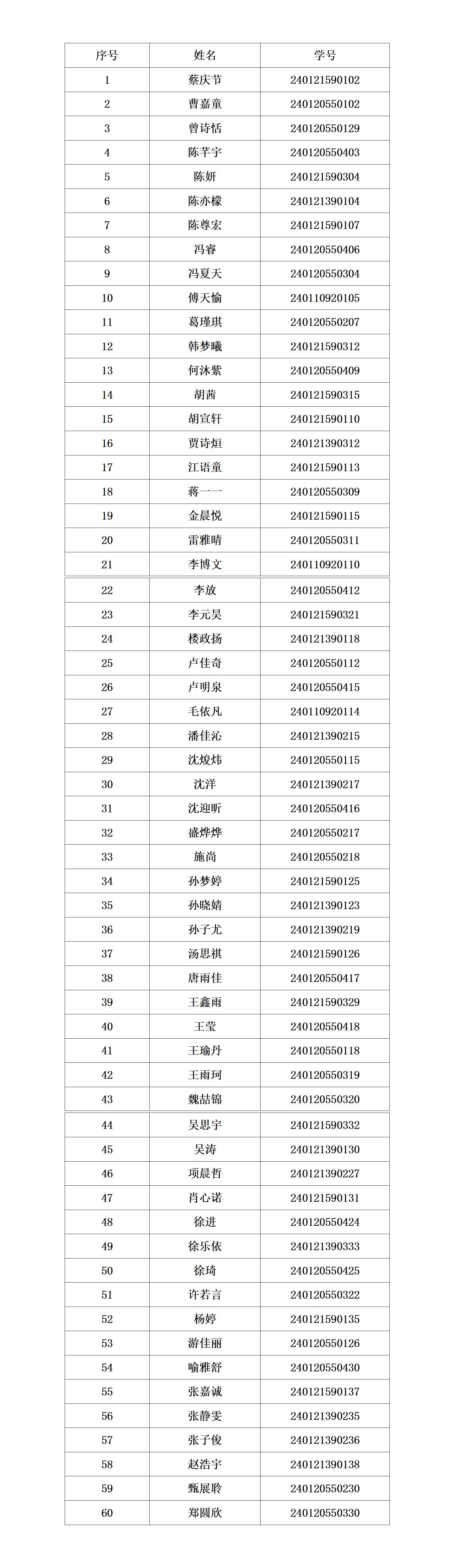 2024年经济学拔尖学生培养基地班新生选拔有效报名136人,按照《关于经济学拔尖学生培养基地班2024级新生选拔的通知》的规定,经按入围面试规则筛选、审核并确定,现将入围面试名单公布如下(名单按照姓名笔画排序)。请入围面试考生尽快加入微信群并积极做好准备工作。