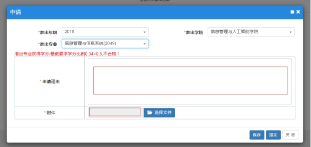 2.选择准出年级(注意:“准出年级”为毕业审核培养方案参照年级,非延长学制学生选“2019”,延长学制学生可选择招生年级或目前所在年级之间的任意年级)和主修准出专业,提交申请;若修读课程比例未达到准出专业的50%,需提交申请理由和替代说明附件,再提交申请。