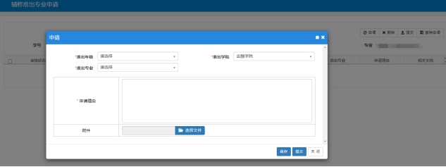 2.选择准出年级(注意:“准出年级”为毕业审核培养方案参照年级,非延长学制学生选“2019”,延长学制学生可选择招生年级或目前所在年级)和辅修准出专业,填写理由,提交申请。