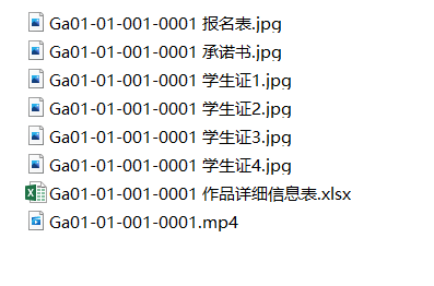 的电子版文件,内容包括:作品文件以及报名表、承诺书、所有作者的学生证拍图、作品详细信息表(作品文件均以参赛编号命名,其他文件命名方式:参赛编号+报名表、参赛编号+承诺书、参赛编号+学生证1、参赛编号+学生证2、作品详细信息表,作品详细信息表格式见附件2),报名表和承诺书都需要电子签名,最后必须以zip或rar压缩包整理所有文件,文件命名为参赛编号,可参看下列图示举例: