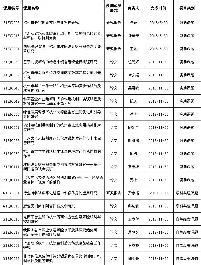 经专家评审,市哲学社会科学规划领导小组审批,2018年度杭州市哲学社会科学规划常规性课题线上赌博平台共立项19项,其中资助课题13项,学科共建课题2项,自筹经费课题4项。现予以公布: