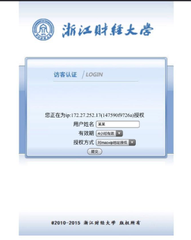 首先,访客的网络设备应连接SSID为Zufe_guest的财大专用访客网络,连接wifi成功以后,打开网页浏览器输入任意网址,浏览器将自动跳转至无线网络认证页面(ios客户端自动弹出访客登入界面,android客户端则须完成连接后打开浏览器输入任意网址,自动跳转至访客登入界面)。