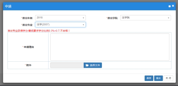 2.选择准出年级和主修准出专业,提交申请;若修读课程比例未达到准出专业的70%,需提交申请理由和替代说明附件,再提交申请(注:“准出年级”为毕业审核时依据哪个年级的培养方案)